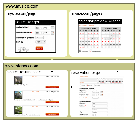 For example, if you embedded the planyo plugin at http://www.yoursite.com/reservations.php, then if you embed a calendar preview widget on your homepage (http://www.yoursite.com/), clicking on a date on this calendar preview will open the reservation form at http://www.yoursite.com/reservations.php. Then let's say you also included a small search box widget on each page of your website. In such case submitting the search will once again open the search results at http://www.yoursite.com/reservations.php. The page with the plugin (/reservations.php) will simply be used to display any planyo-related content, including things like reservation details (link to the reservation details page can be added to the emails sent to the customer), online modifications by customer, or cancellations (also here the links can be very easily added to the emails sent to the customers by using tags from Q204).