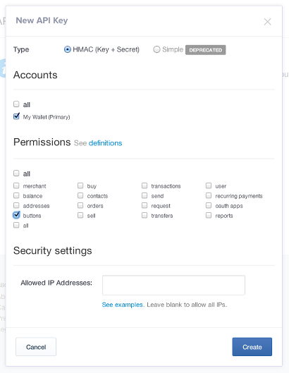 Then generate a new API key of type: HMAC (Secret+KEY) -- this is the default. In PERMISSIONS make sure you ONLY select BUTTONS. We do NOT want to give more permissions to this api key.