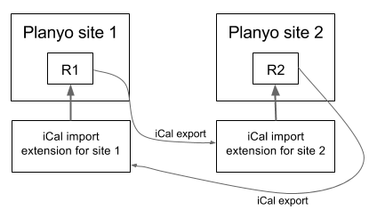 Site settings / Data export iCal), and the iCalendar import extension available in the Planyo Store. Both planyo sites with need to import and export the iCal feeds in order to perform a 2-way synchronization. Here's the diagram of the setup needed:
