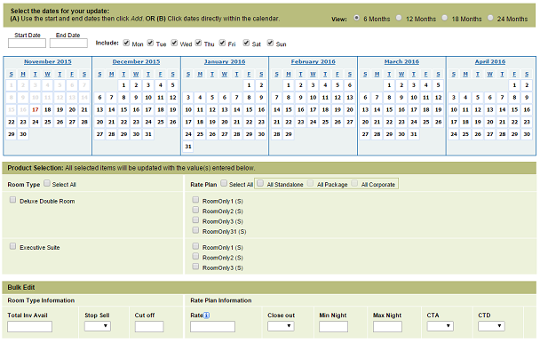 In order to update a range of dates, choose Rates and Inventory > Bulk update from the main menu.