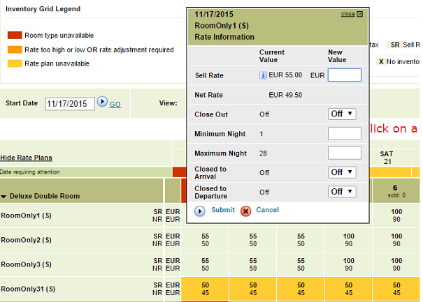 You can also change rates and restriction for individual days directly on the Inventory Grid page. Once you click a cell, a pop-up window appears where you can modify the data.