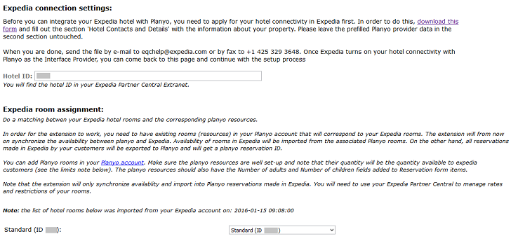 First of all, you need to specify your Expedia hotel ID so Planyo can access your property. Once this is done, the extension will download the list of your hotel rooms.