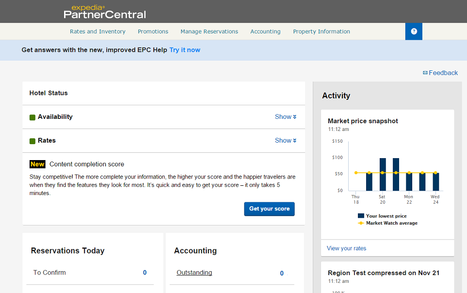 Expedia Partner Central (EPC) is the place that includes direct access for you to manage rates, financial details and processes, detailed information about your property as well as a number of other tools. In EPC you can view detailed information about your reservations, including credit card or Expedia virtual card data. It also provides you with reservation statistics and accounting information.