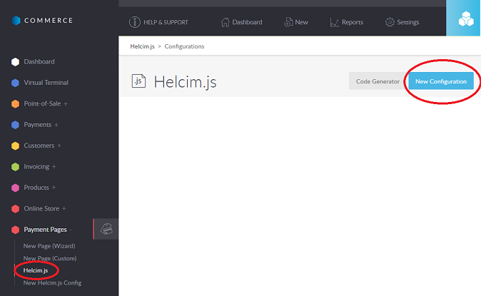 To create a new configuration, login to Helcim Commerce. Choose Payment Pages / Helcim.js in the menu on the left and then in the main panel click New Configuration.