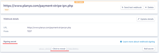 Once you click the Add endpoint button to submit the settings, the Signing secret section appears below Webhook details (see the picture below). Click the Click to reveal button to see the webhook secret and copy the value.