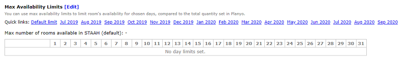 By specifying a maximum availability limit, you limit the room's availability sent to STAAH for chosen days, compared to the total quantity set in Planyo. The Max number of rooms available in STAAH (default) value applies to all reservation dates. Additionally, you can modify the value up or down for individual days. If you don't specify any limits, either default or for specific days, the availability will depend solely on the resource's availability in Planyo.