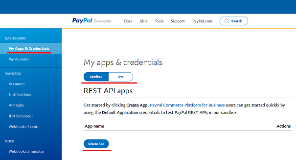 2. In Dashboard on the left, click My Apps & Credentials. At the top of the page, you can switch between live and sandbox apps. Note that you create apps in the sandbox and live modes separately (see the image below).