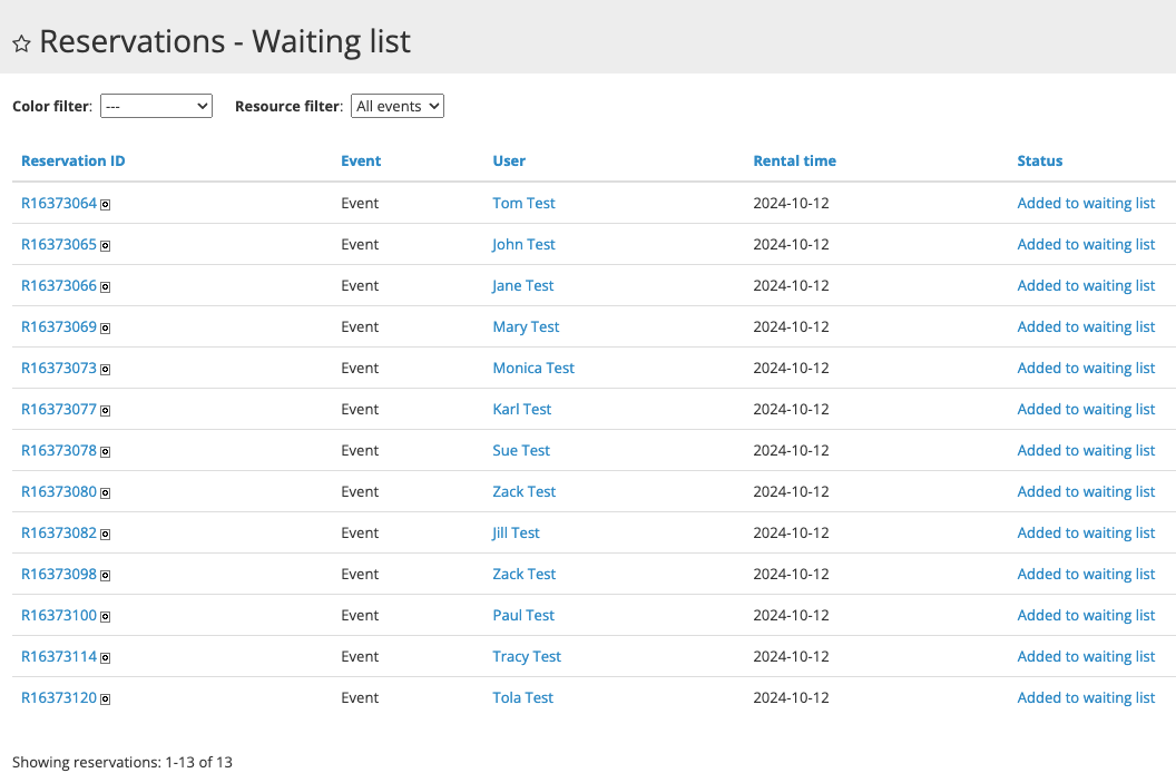 You can always see the reservations in the waiting list in: Reservations / Waiting list. Here we have 13 waiting list items from which 10 will become valid reservations once the Zapier automation launches at the scheduled time.