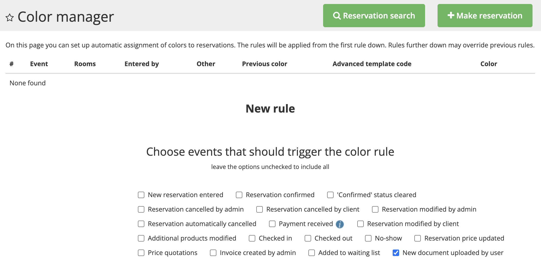 Once the customer uploads a new document the administrator is sent an email notification. At the same time we'll configure a color manager rule which will once again change the color of reservations awaiting manual confirmation. Let's add the label